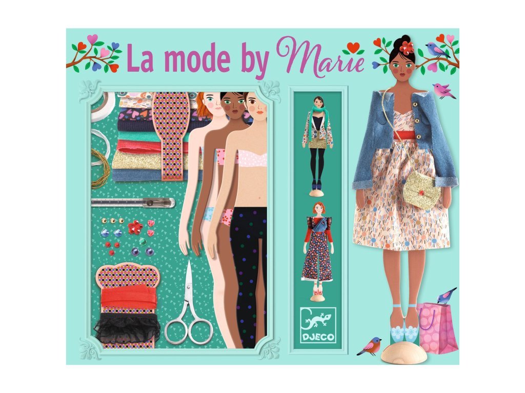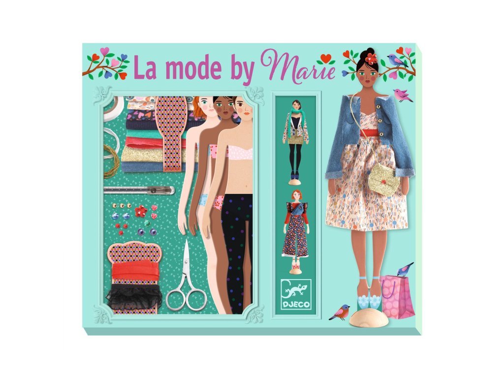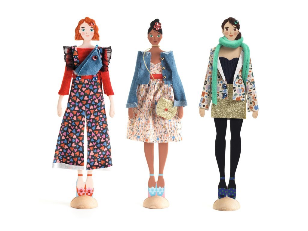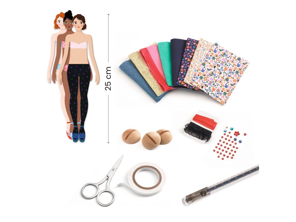 Obsah: 3 panenky, 3 dřevěné podstavce, 1 potištěná látka, 4 látky z různých materiálů, 5 prýmků nebo stuh, 2 délky elastické šňůry, 1 sáček s korálky a drobné doplňky, 1 arch samolepicích kamínků, 1 nůžky, 1 role oboustranné pásky, 1 pero a 3 šablony