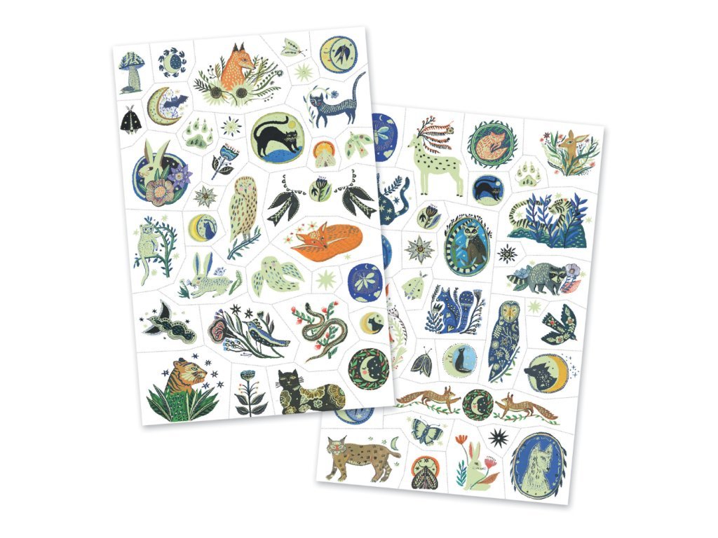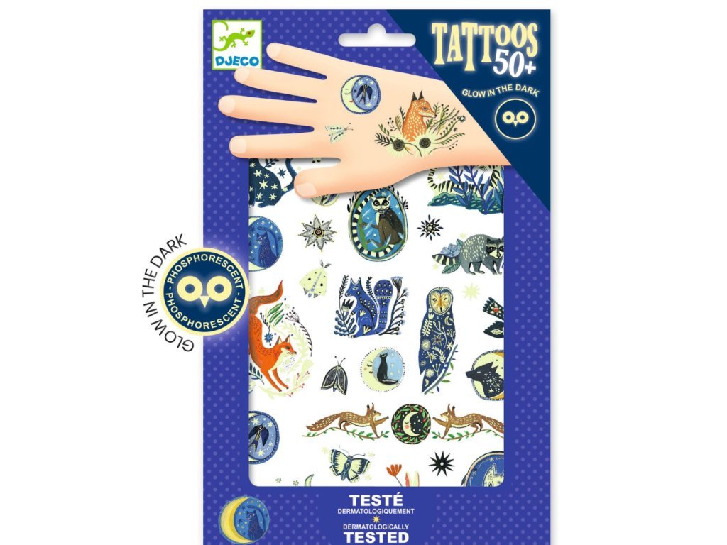 Tetování s noční tématikou a roztomilými zvířátky. K radosti dětí se po zhasnutí světel objeví překvapení a malé detaily svítící ve tmě! Tato dočasná tetování jsou předem vystřižená, takže se snadno používají: stačí nanést trochu vody. Dermatologicky testováno.