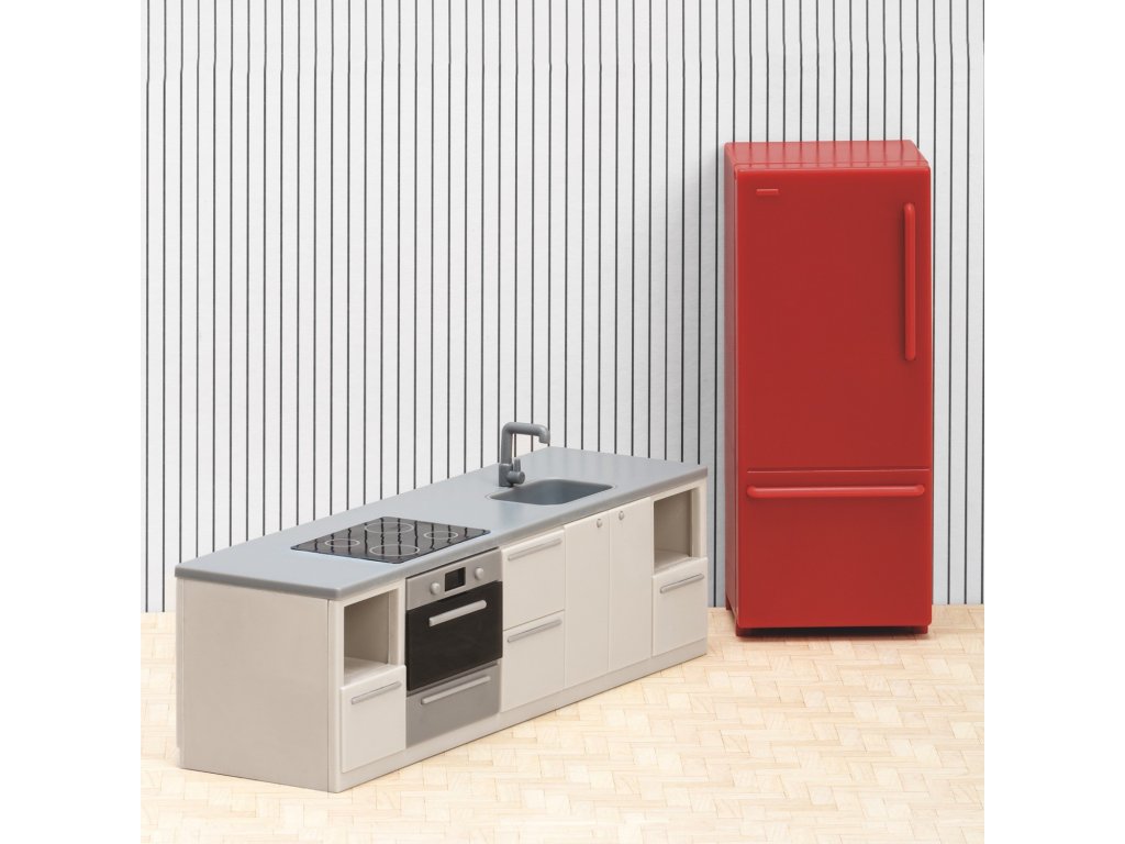 O kuchyni se často mluví jako o srdci domova - a to je v tomto domečku pro panenky Lundby určitě pravda. V této kuchyňské sestavě mají vaše panenky vše, co potřebují, aby si mohly společně pochutnat na lahodných pokrmech. Kuchyňská linka je vybavena varnou deskou, troubou, dřezem a dvěma otevřenými úložnými prostory. Lednička se může otevírat.